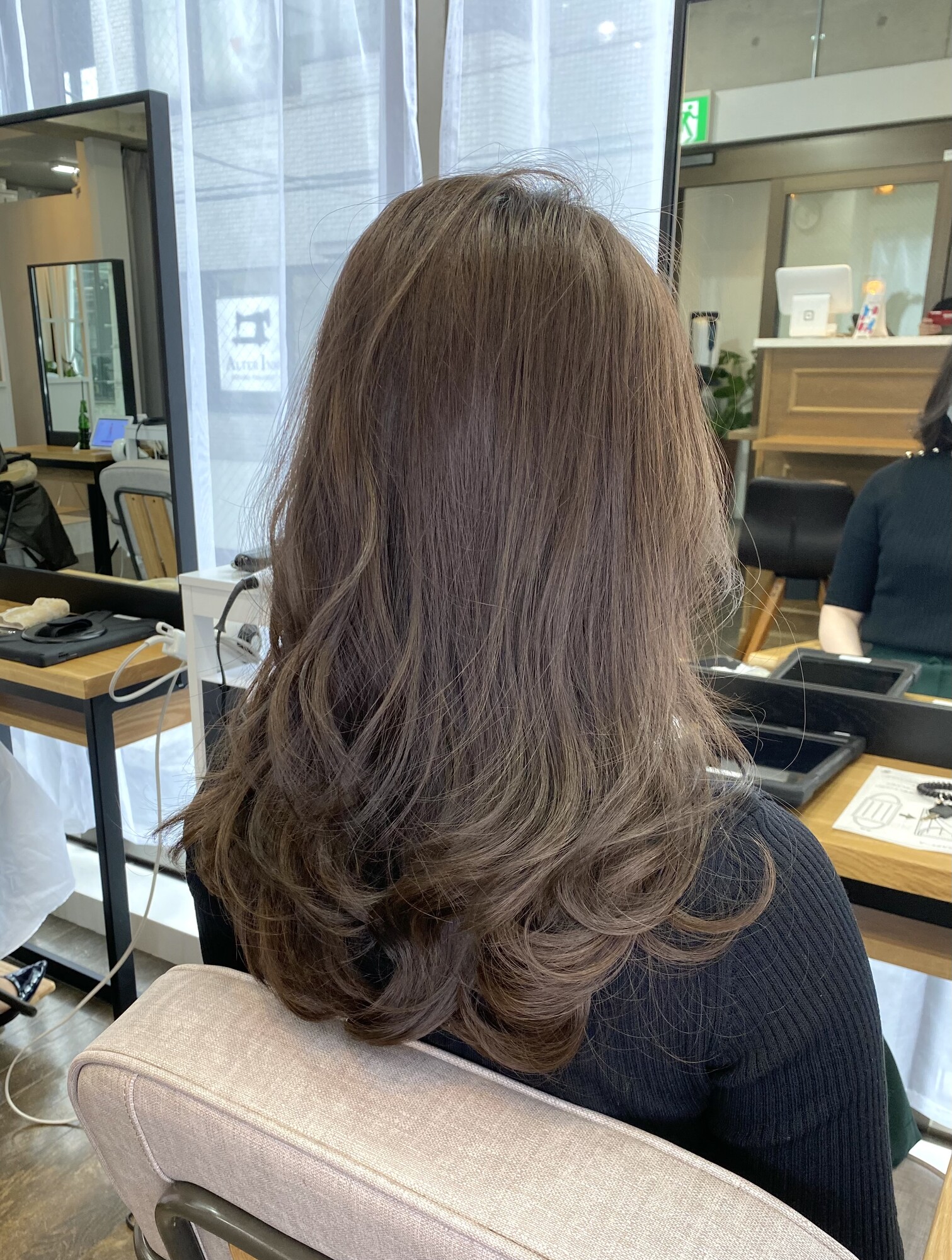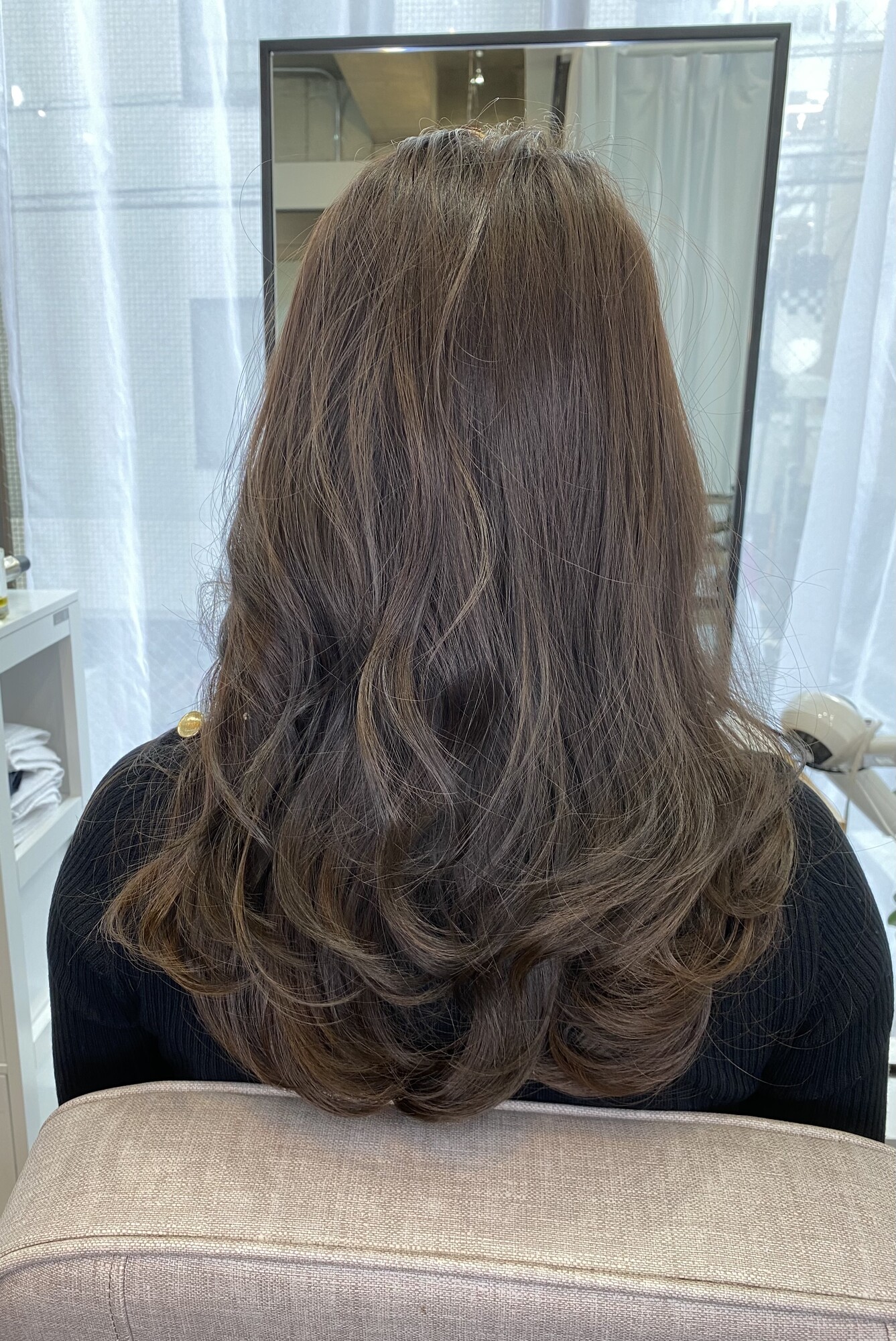 - ミルクティー系のカラーリングで柔らかく透明感のあるカラーにすきバサミを使わないレイヤーカットで巻きやすく扱いやすいロングヘアです!