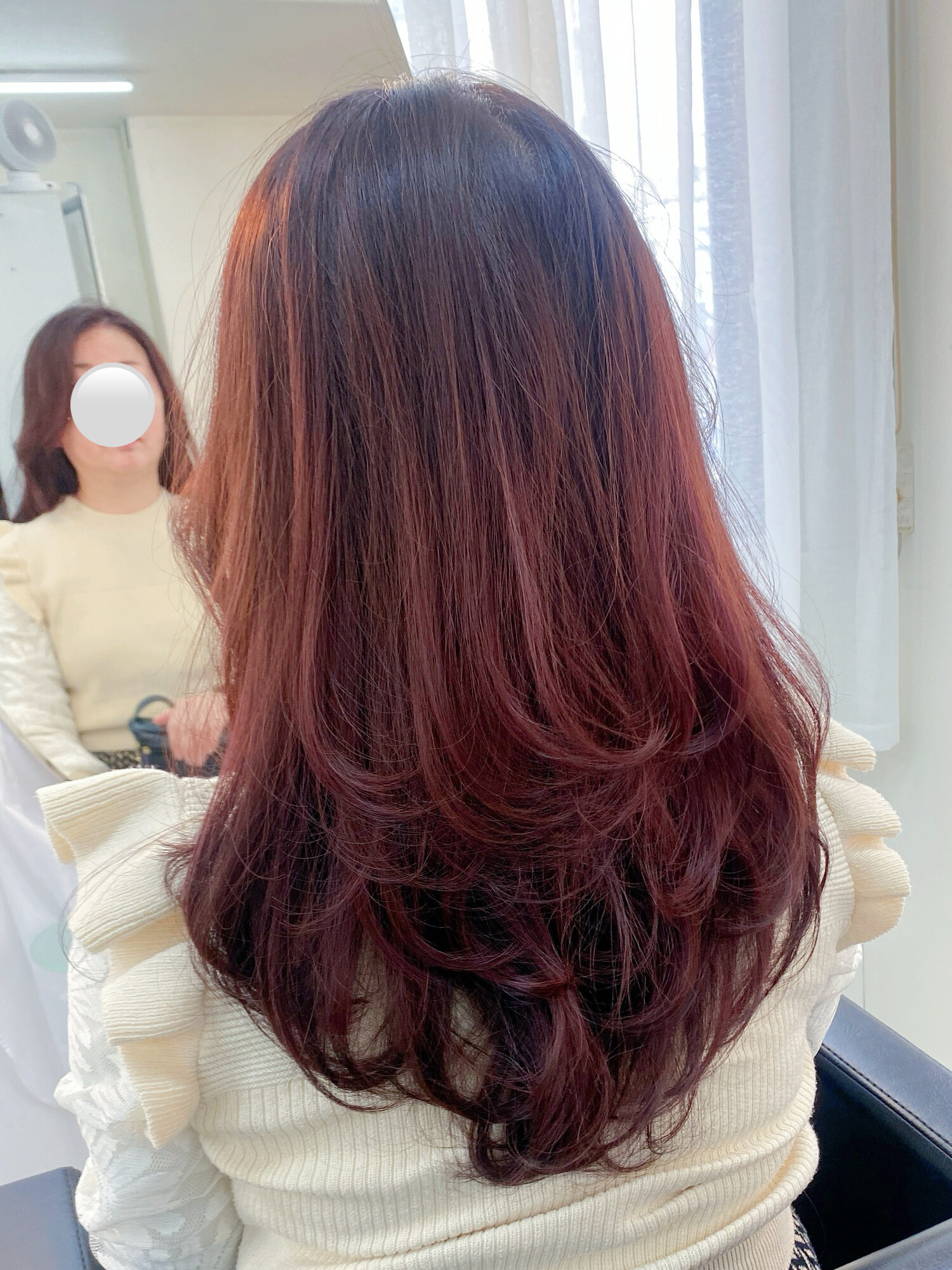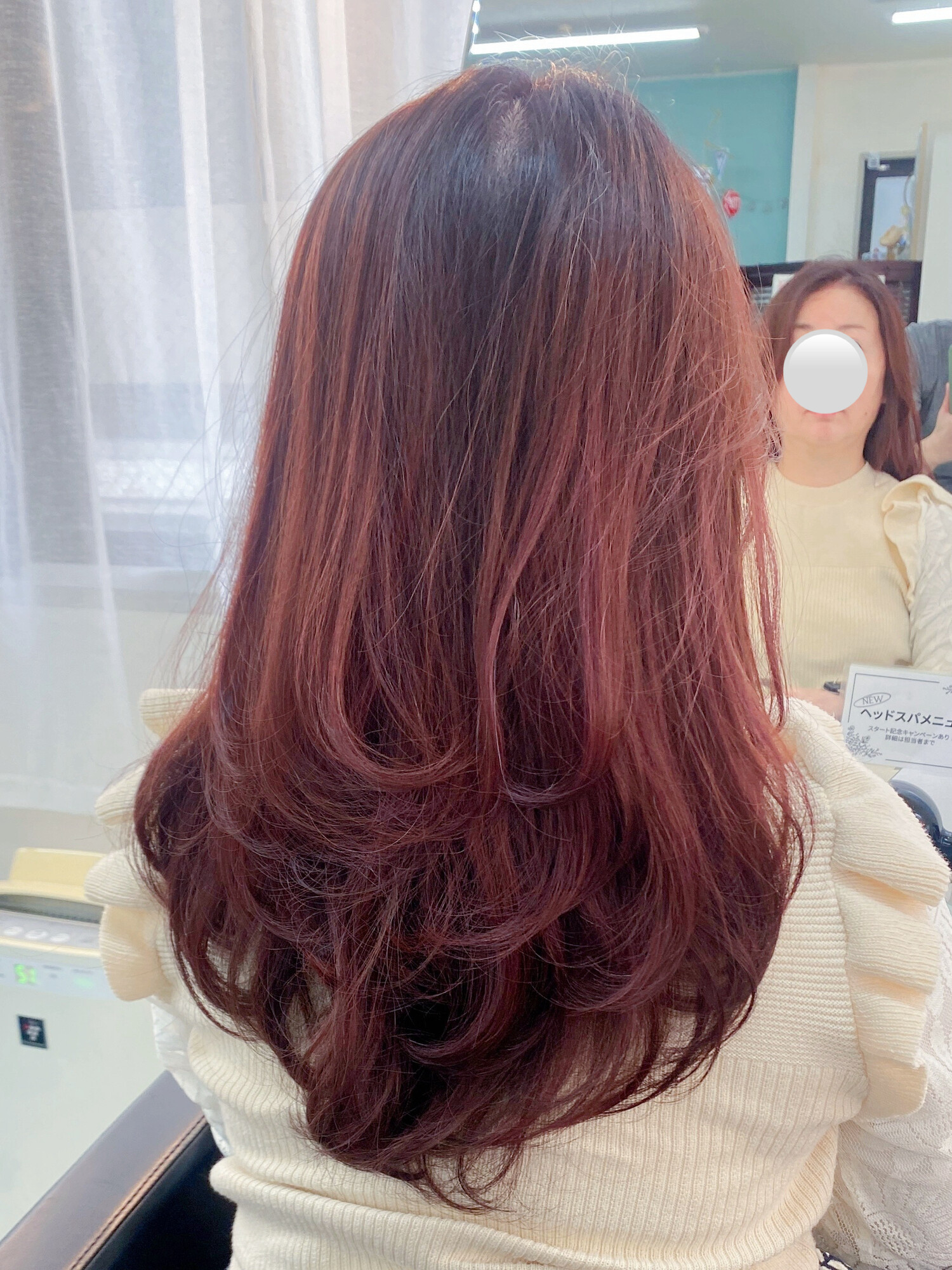 - 前上がりにカットし、しっかりレイヤーを入れたロングレイヤースタイル。コテで巻いてあげると、動きがでてよりエレガントで女性らしいスタイルになります