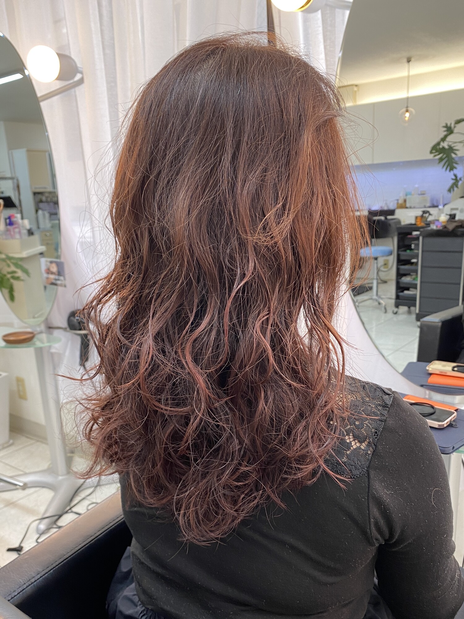 - レイヤーを入れて、デジタルパーマで上からしっかりウェーブをつけた動きのあるスタイルです