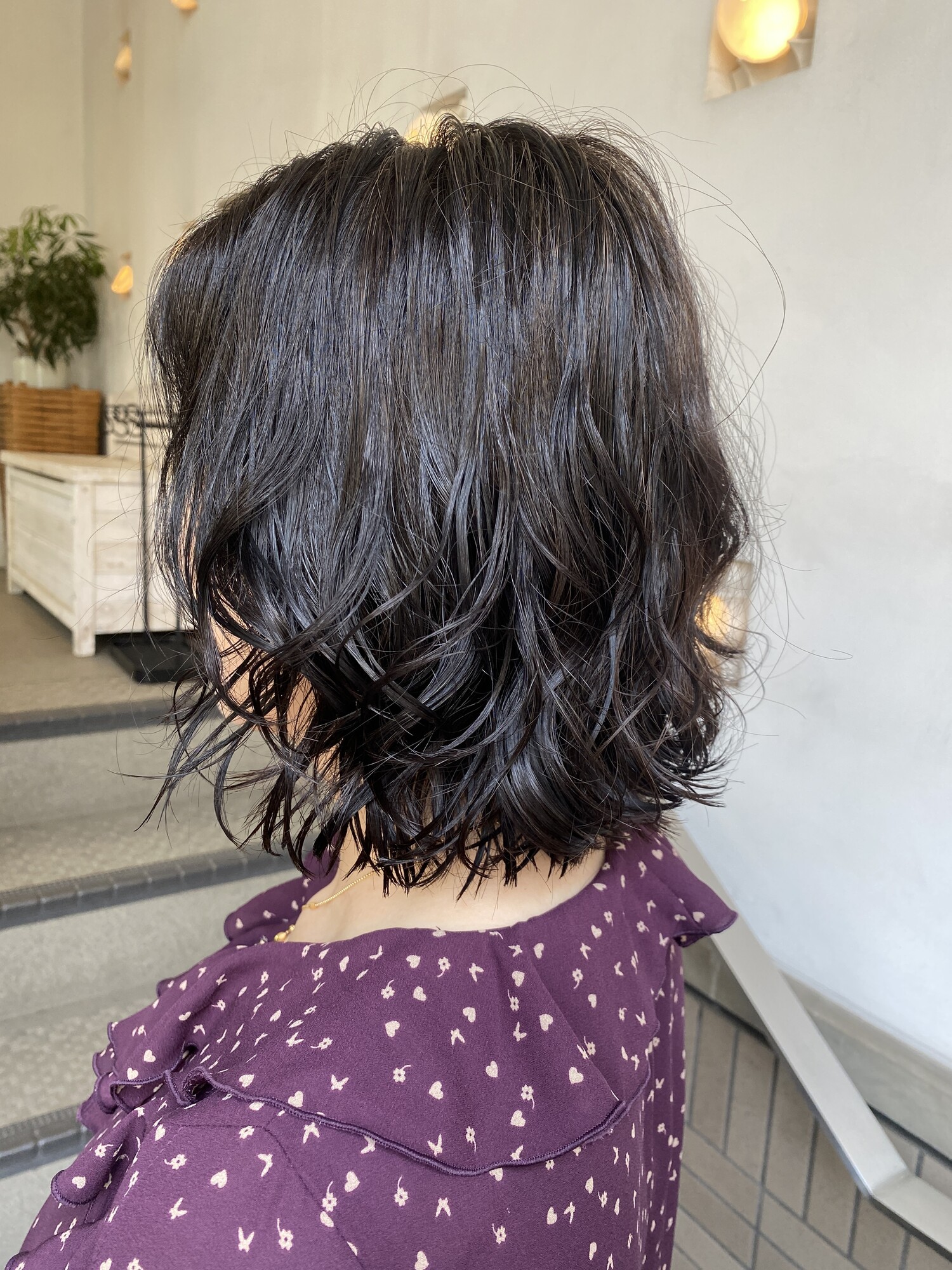 - 耳くらいから、ウェーブがでるようにパーマをかけています。レイヤーを入れ、軽さもプラス