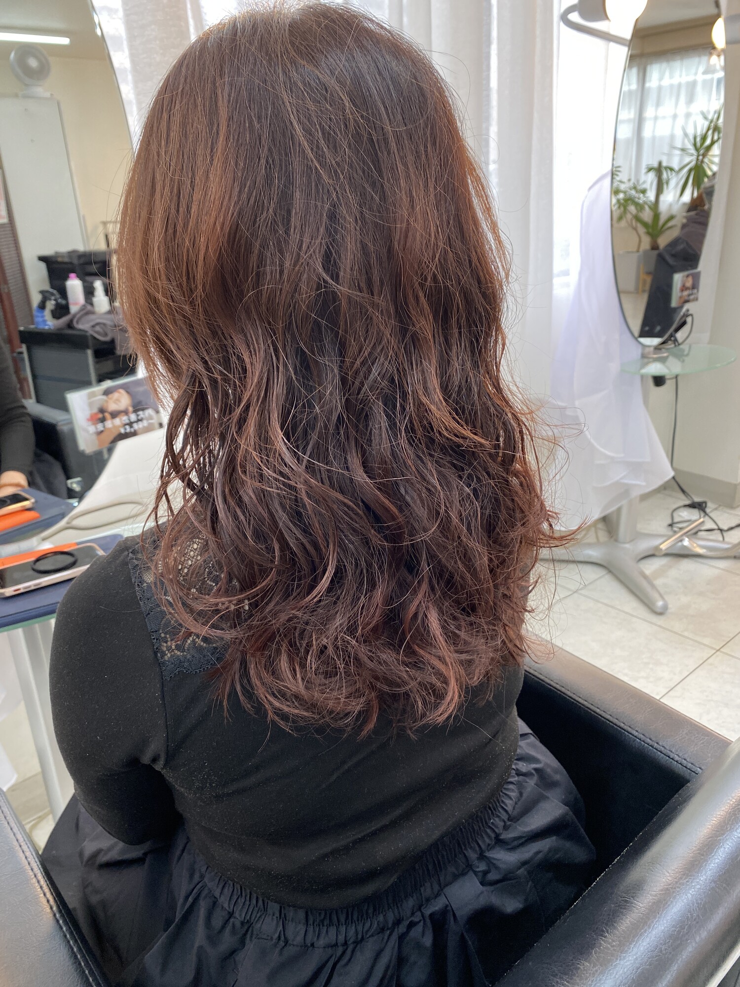 - レイヤーを入れて、デジタルパーマで上からしっかりウェーブをつけた動きのあるスタイルです